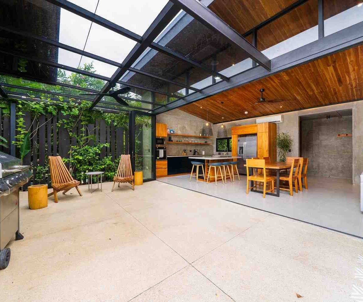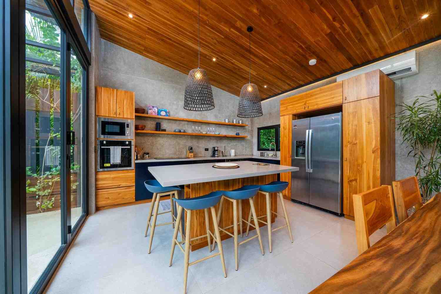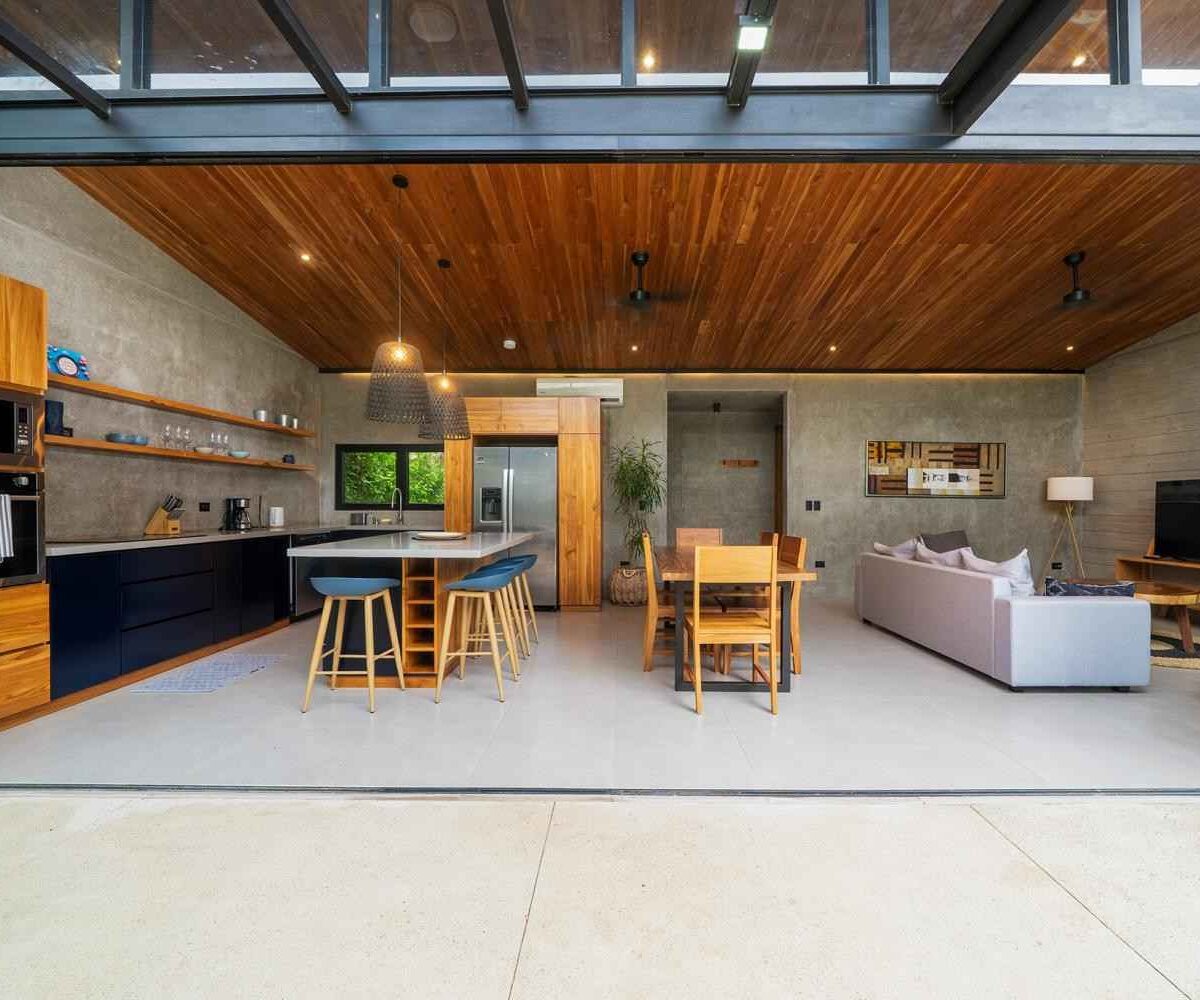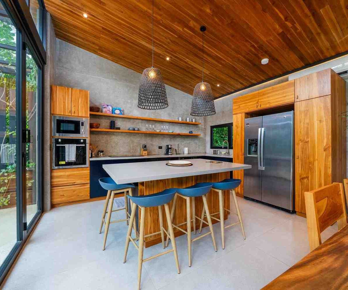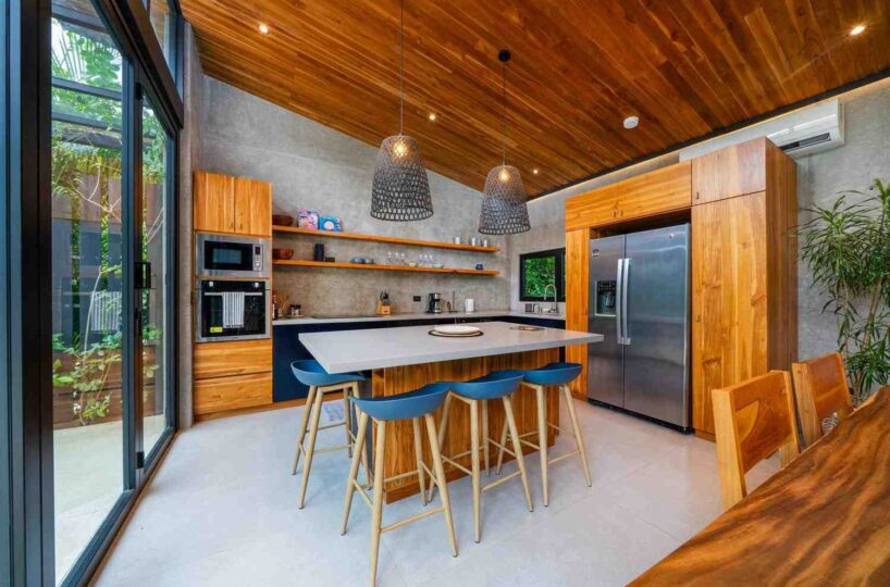 The home features a bright open-concept kitchen with quartz countertops, a spacious island with seating, and high-end stainless-steel appliances, making it ideal for cooking and entertaining. The dining area crafted with Costa Rican teak seats six, while the living room is complete with air conditioning, a large smart TV, and high-speed internet—perfect for both relaxing and remote work.