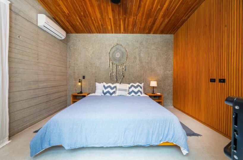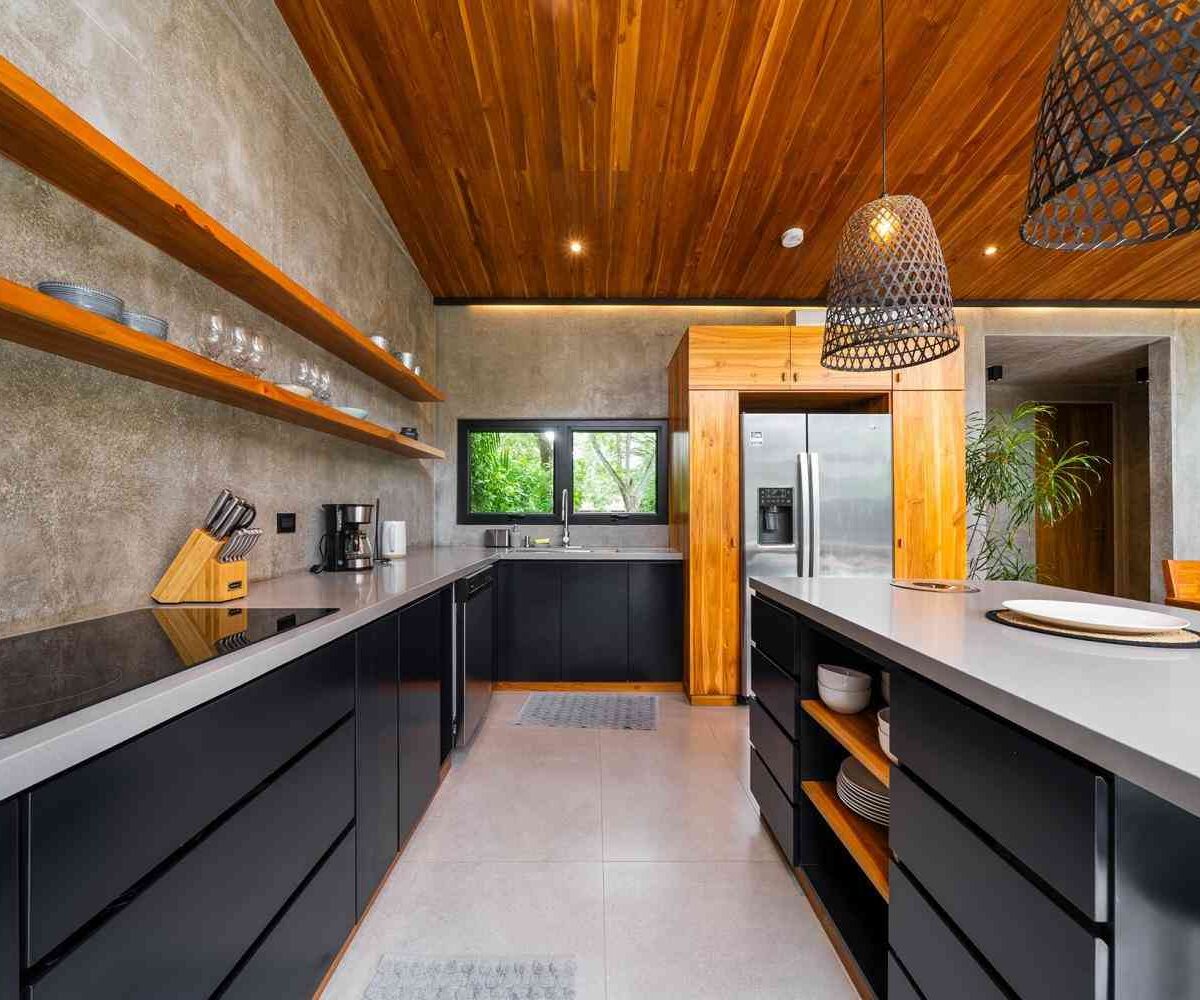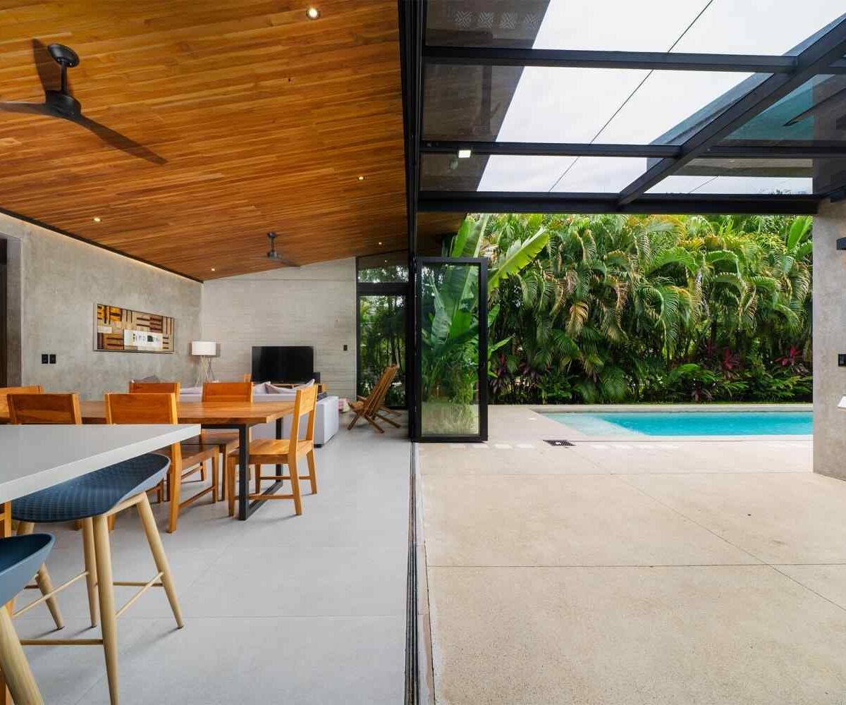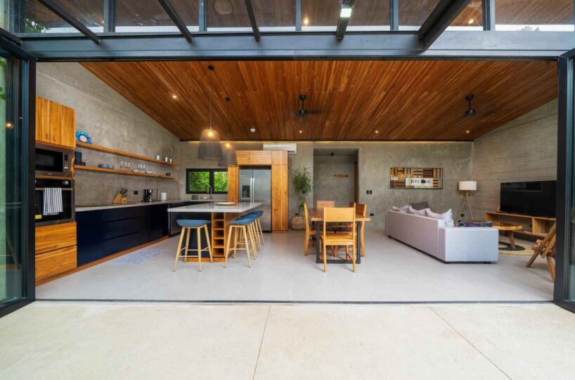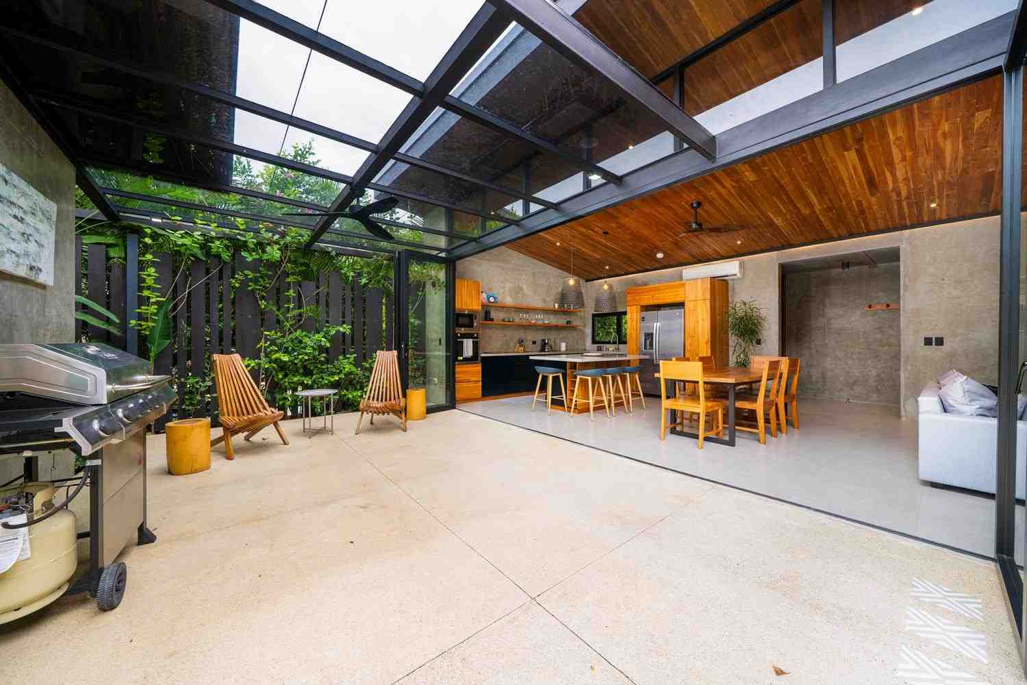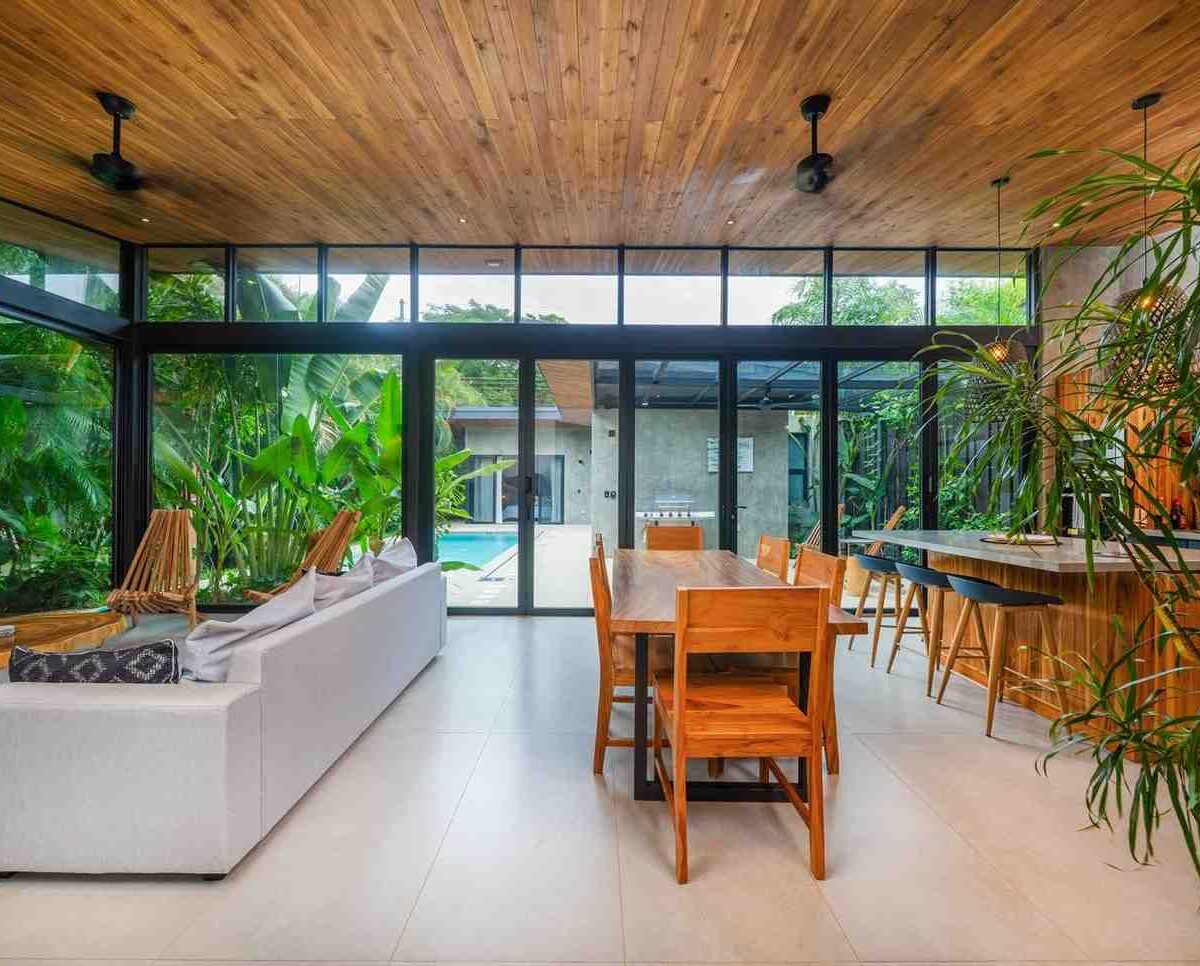 The home features a bright open-concept kitchen with quartz countertops, a spacious island with seating, and high-end stainless-steel appliances, making it ideal for cooking and entertaining. The dining area crafted with Costa Rican teak seats six, while the living room is complete with air conditioning, a large smart TV, and high-speed internet—perfect for both relaxing and remote work.
