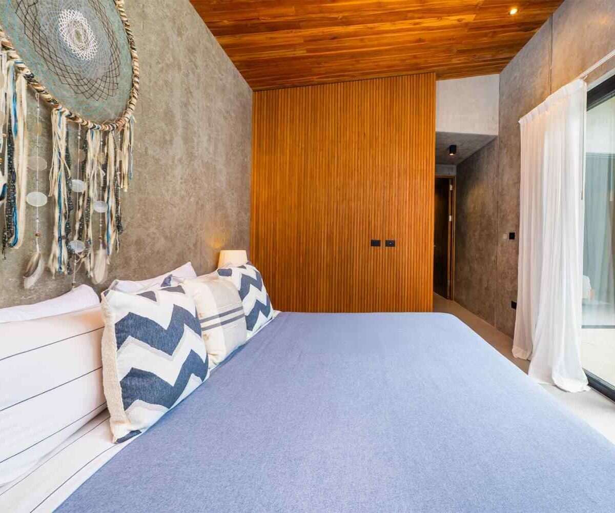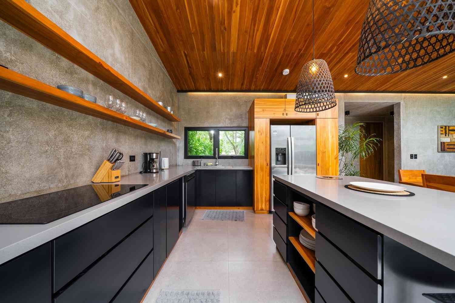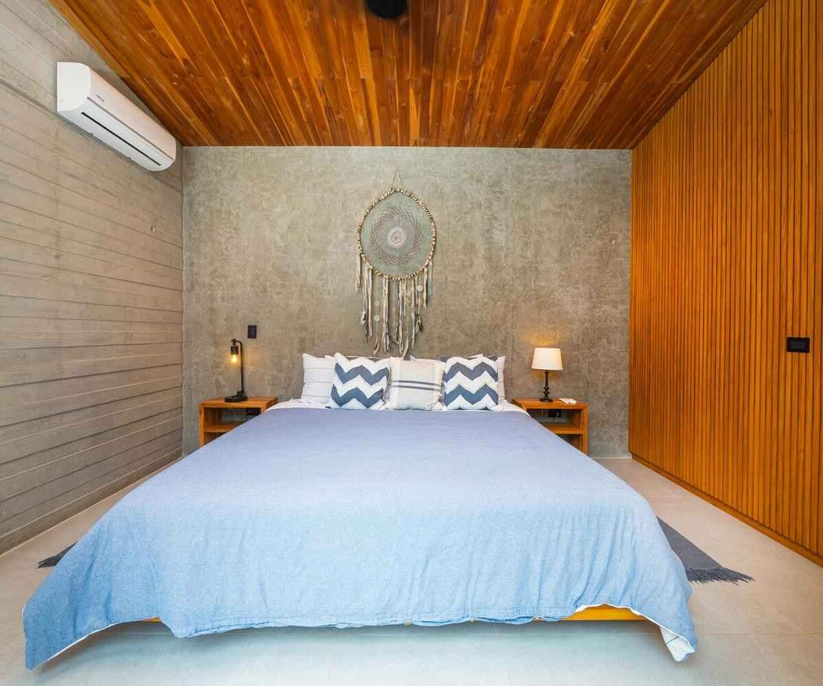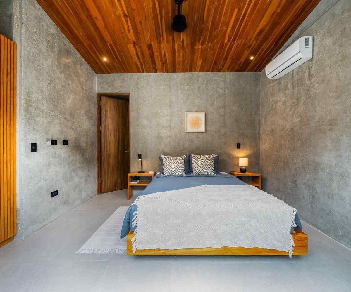 The home features a bright open-concept kitchen with quartz countertops, a spacious island with seating, and high-end stainless-steel appliances, making it ideal for cooking and entertaining. The dining area crafted with Costa Rican teak seats six, while the living room is complete with air conditioning, a large smart TV, and high-speed internet—perfect for both relaxing and remote work.