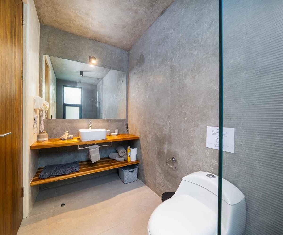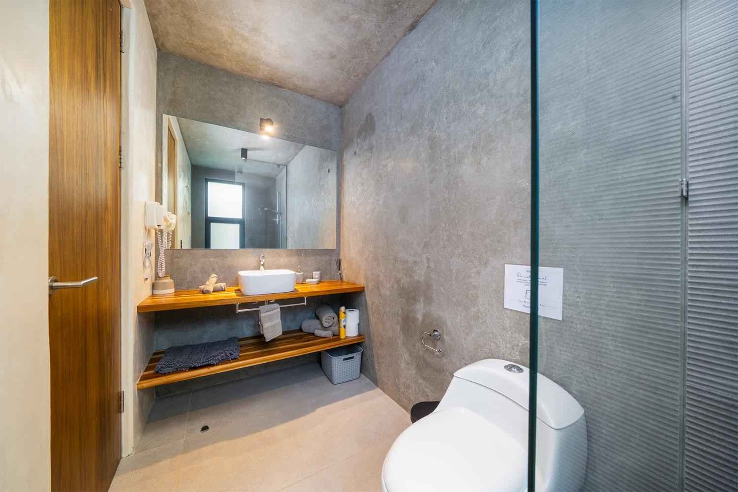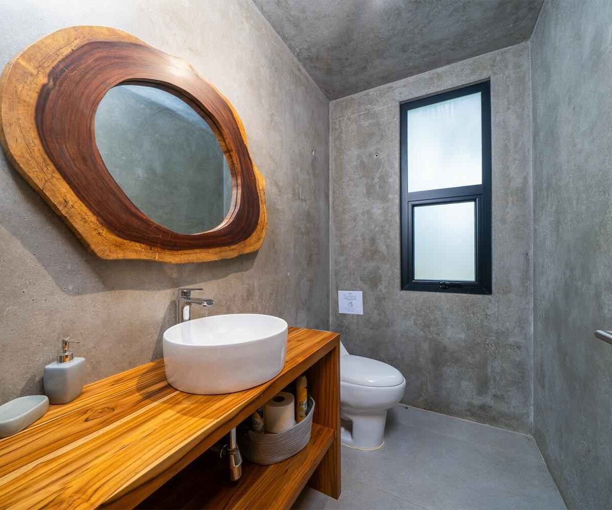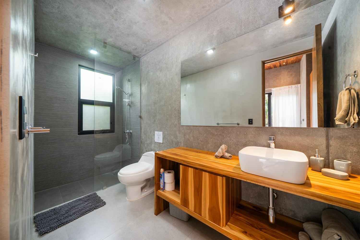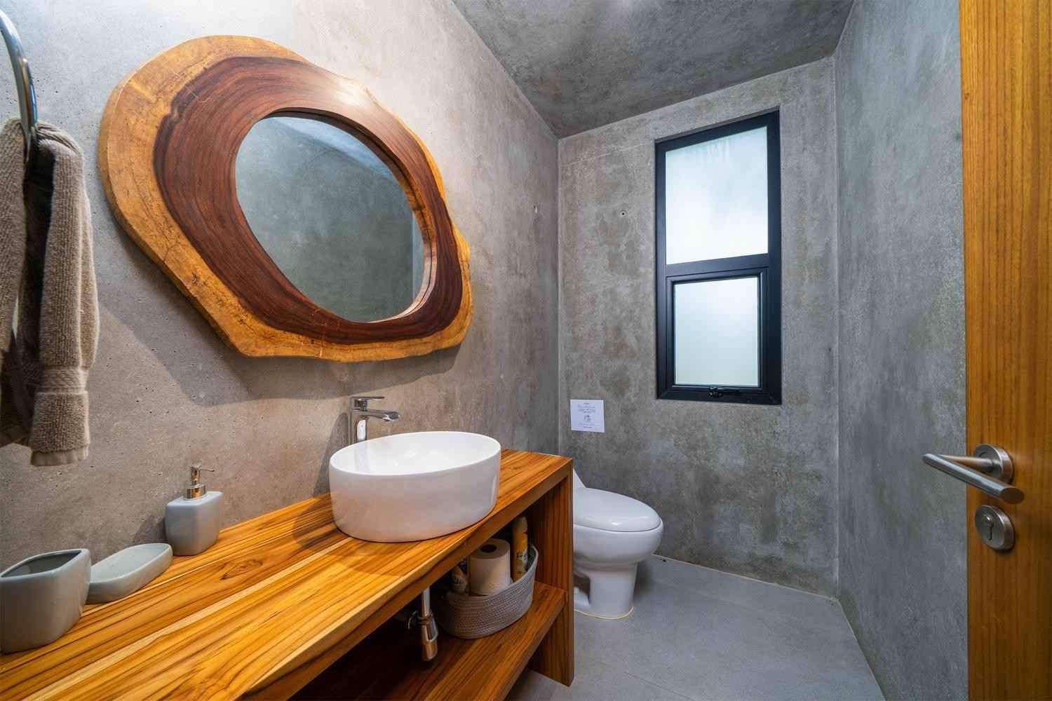 The home features a bright open-concept kitchen with quartz countertops, a spacious island with seating, and high-end stainless-steel appliances, making it ideal for cooking and entertaining. The dining area crafted with Costa Rican teak seats six, while the living room is complete with air conditioning, a large smart TV, and high-speed internet—perfect for both relaxing and remote work.