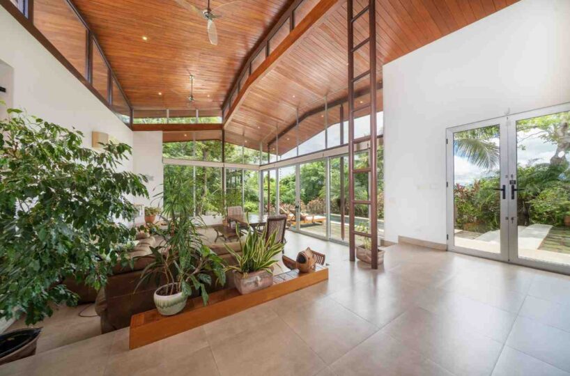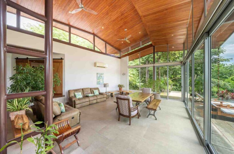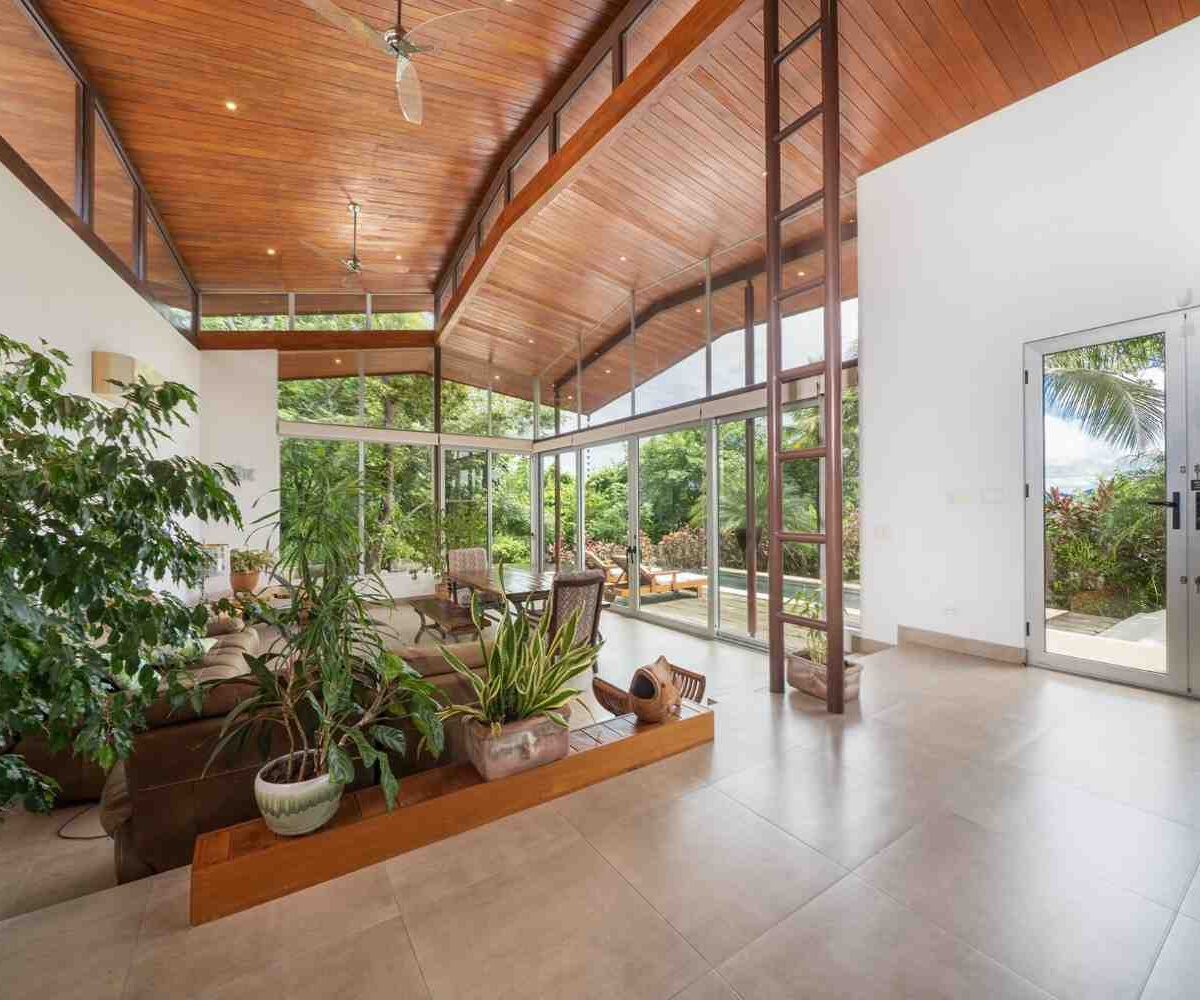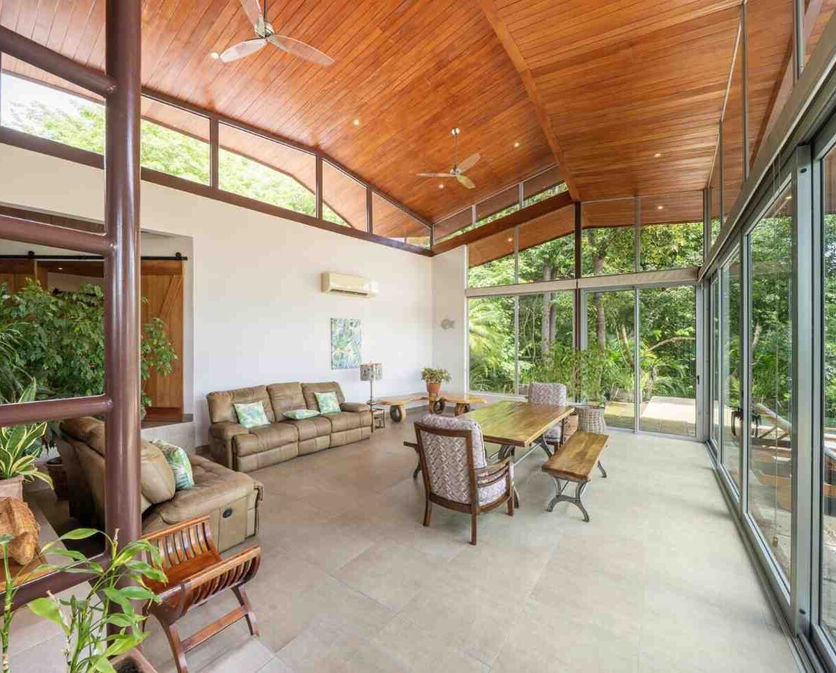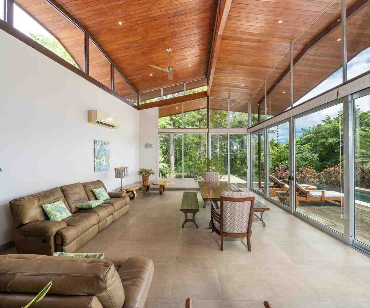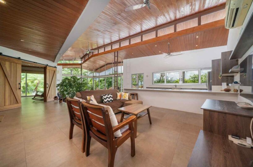 Positioned atop a lush mountain ridge, the home enjoys panoramic views of the surrounding tropical forest. The open-concept layout features high ceilings, oversized windows, and sliding glass doors that invite nature in. The kitchen, dining, and living areas flow together effortlessly, creating a light-filled, elegant space for entertaining or relaxing.