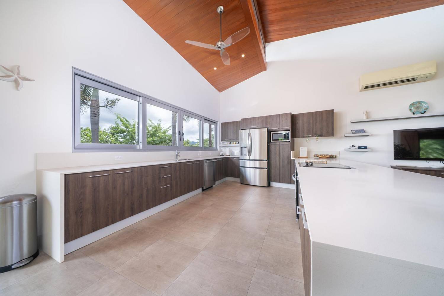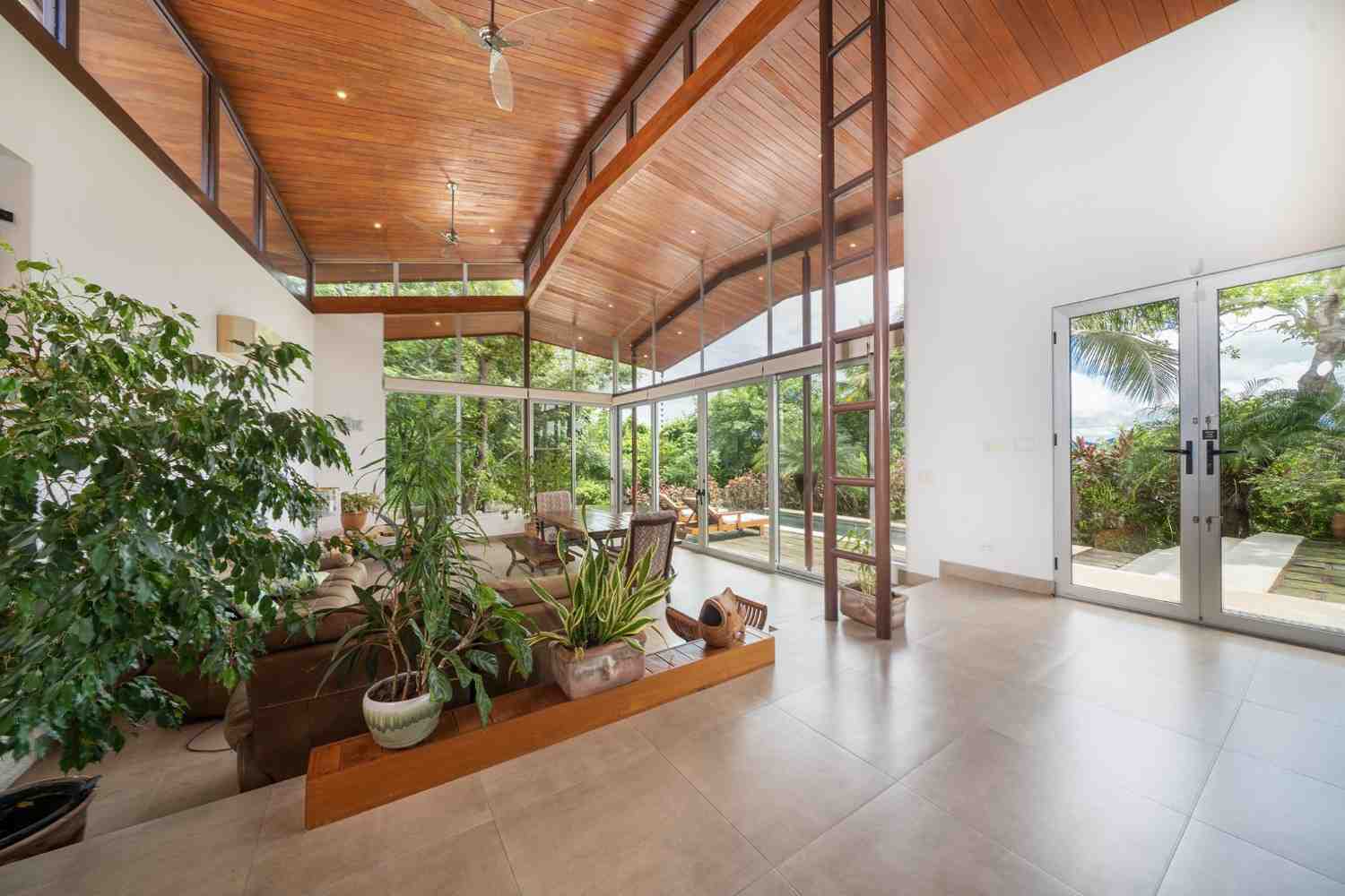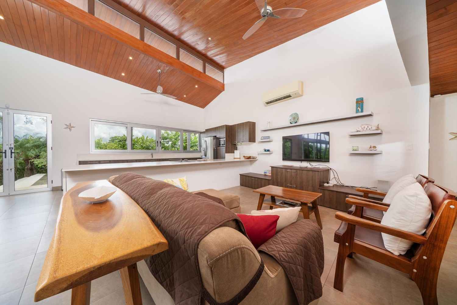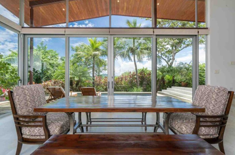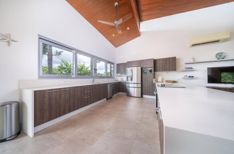 Positioned atop a lush mountain ridge, the home enjoys panoramic views of the surrounding tropical forest. The open-concept layout features high ceilings, oversized windows, and sliding glass doors that invite nature in. The kitchen, dining, and living areas flow together effortlessly, creating a light-filled, elegant space for entertaining or relaxing.