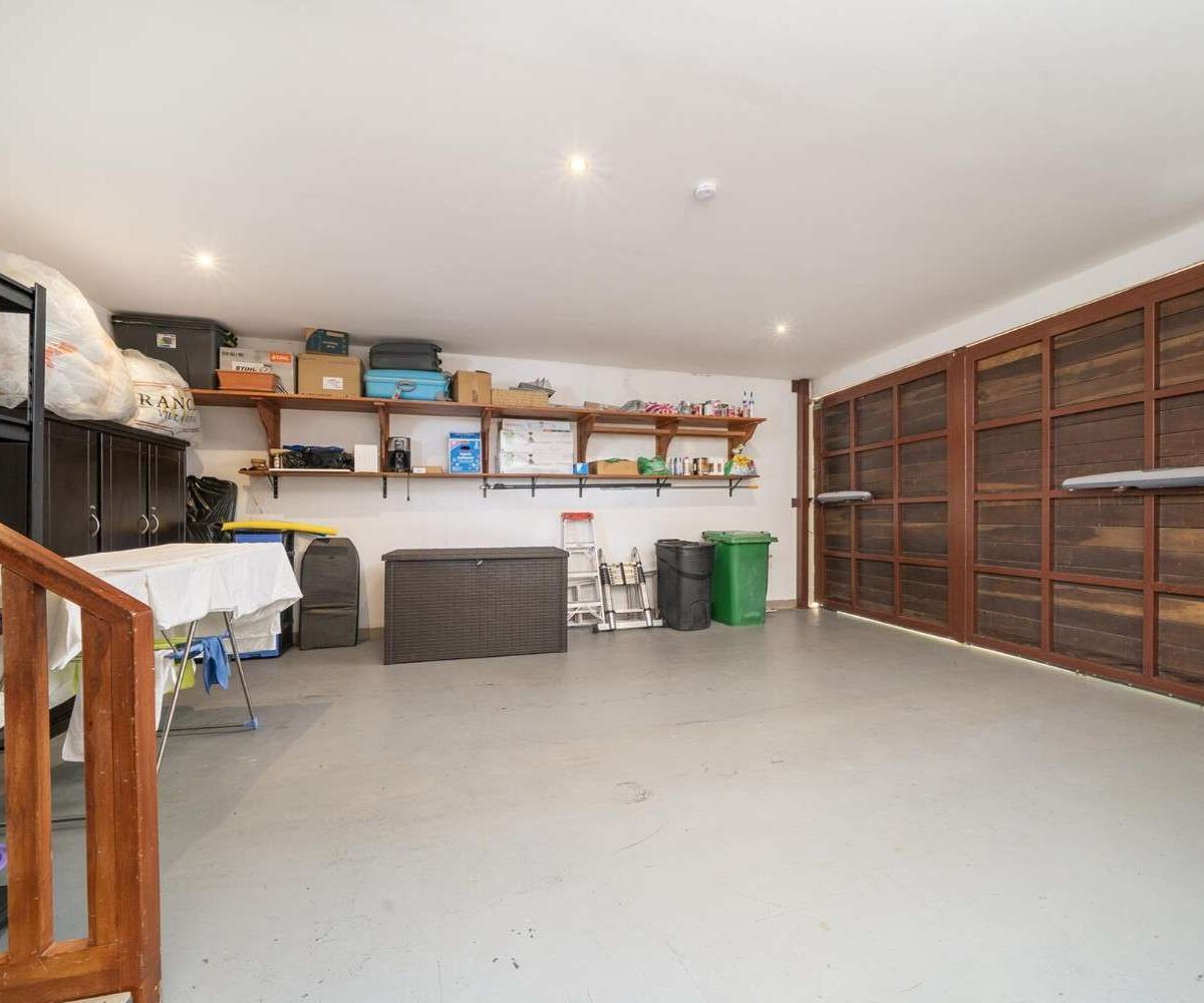 The spacious primary suite includes an en-suite bathroom and Smart TV, while the second bedroom—set on the opposite side of the home—offers privacy, garden views, and its own bathroom. A stylish half-bath serves guests and the main living area.