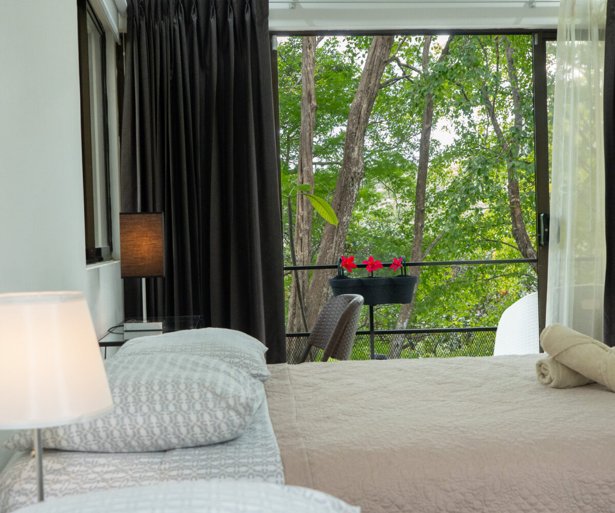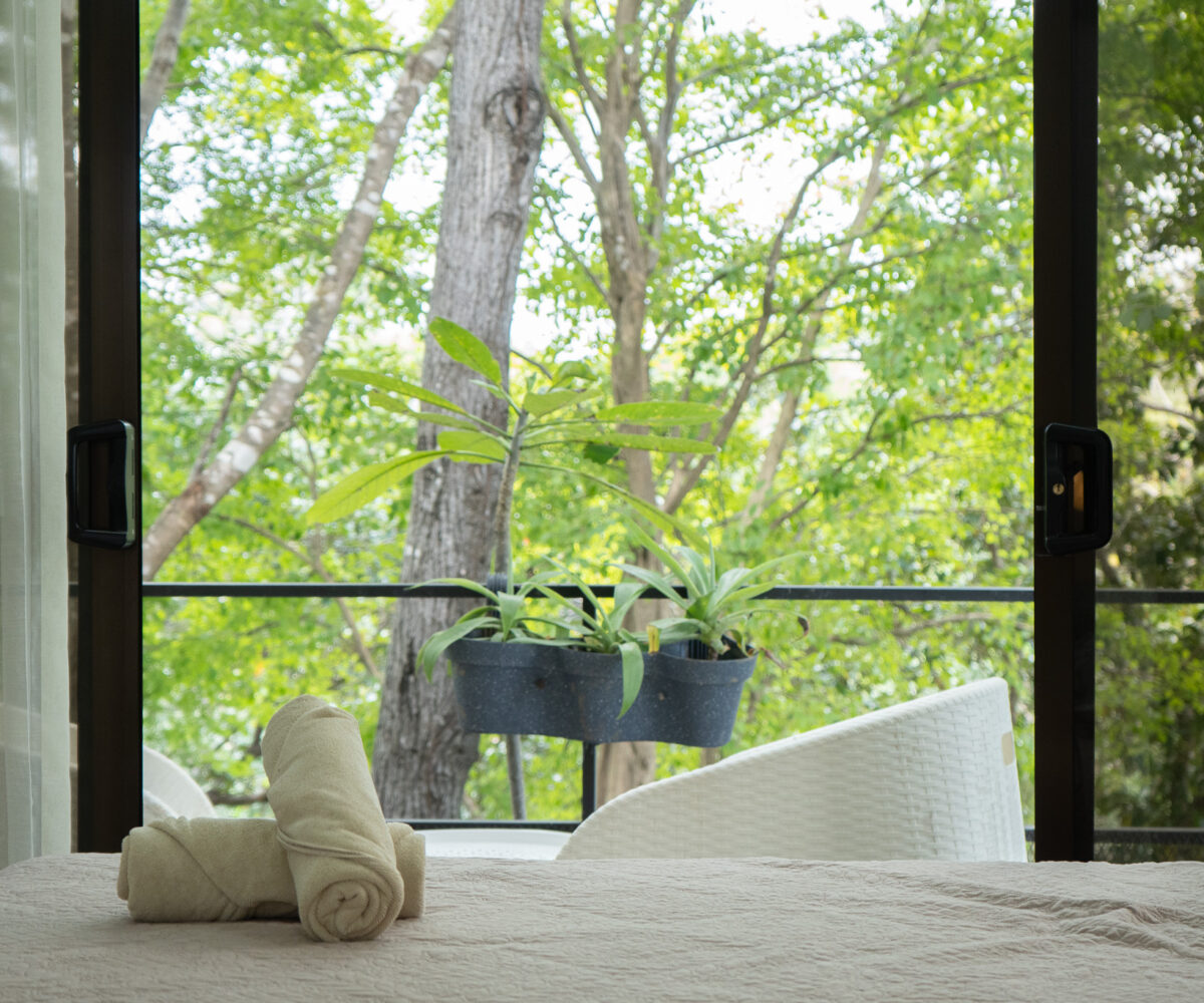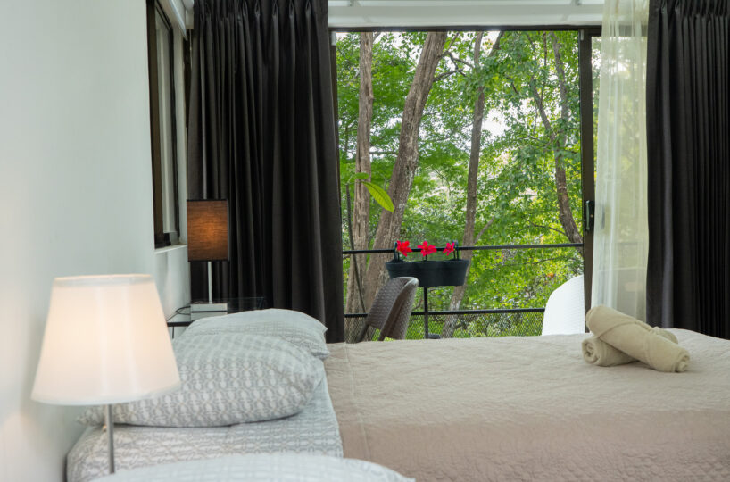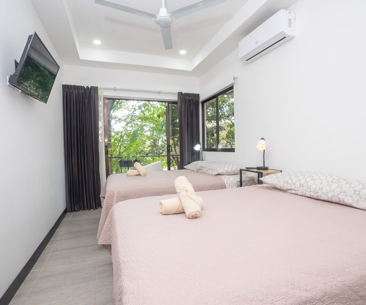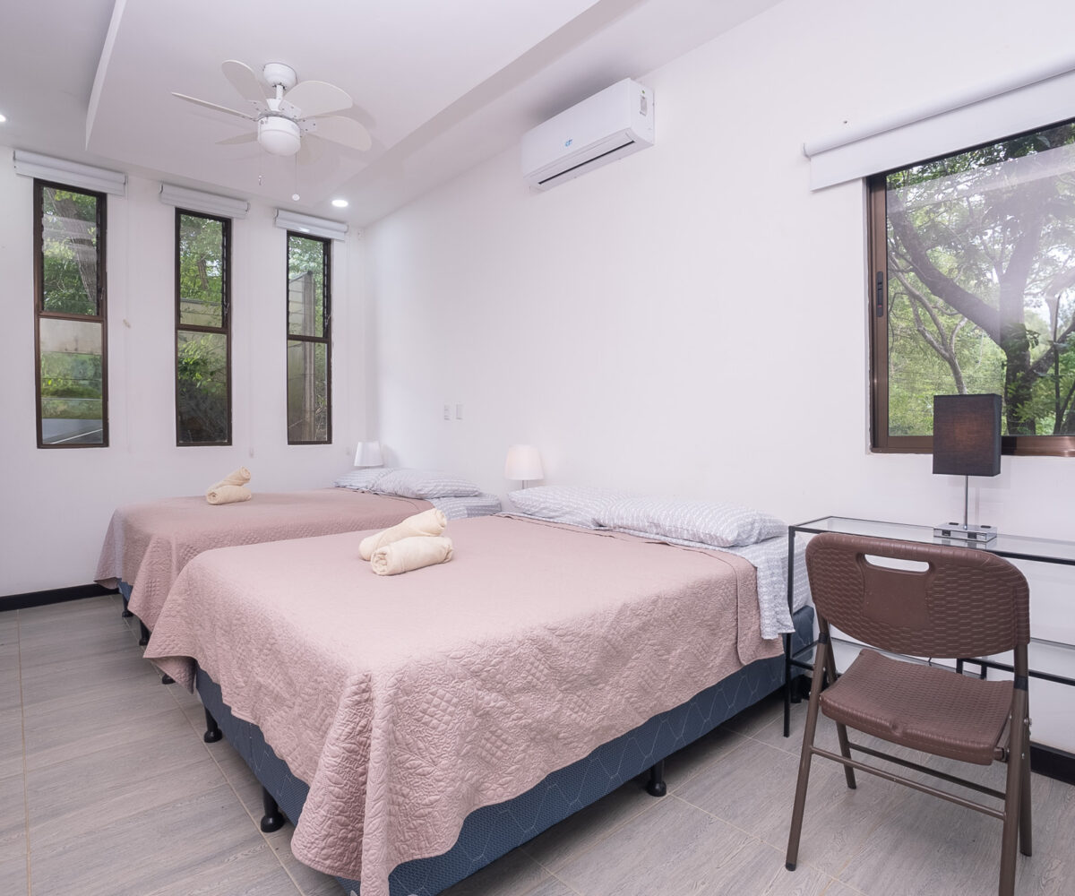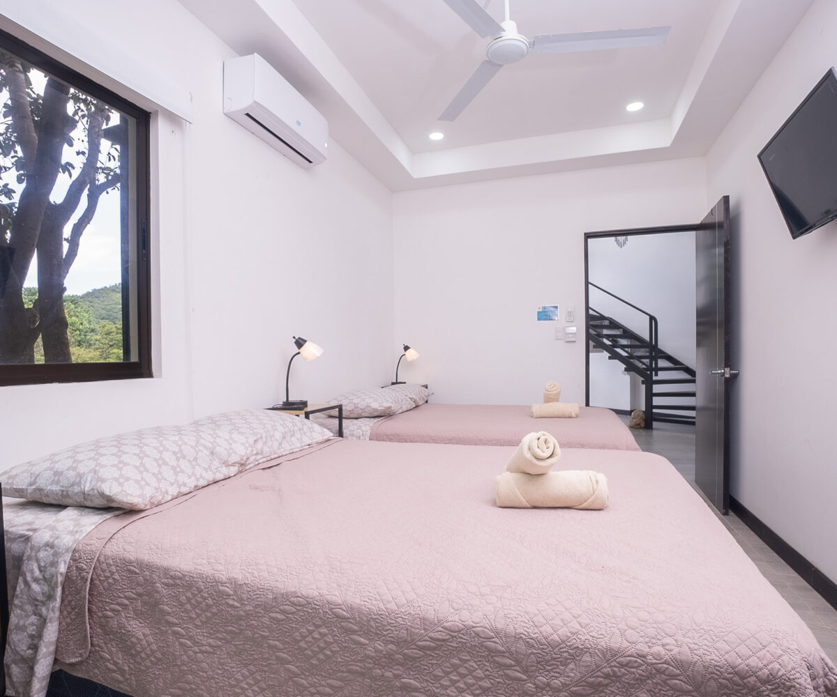 Las dos habitaciones están cuidadosamente distribuidas para ofrecer privacidad y descanso, con grandes ventanas que permiten disfrutar del verde paisaje circundante. Cada rincón ha sido diseñado para brindar confort, frescura y una conexión constante con la naturaleza.