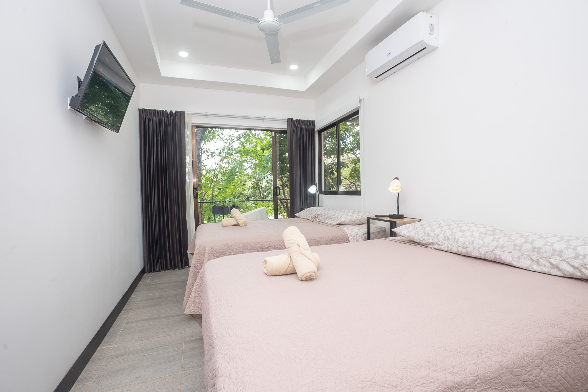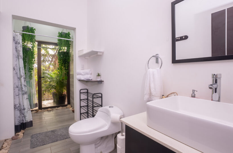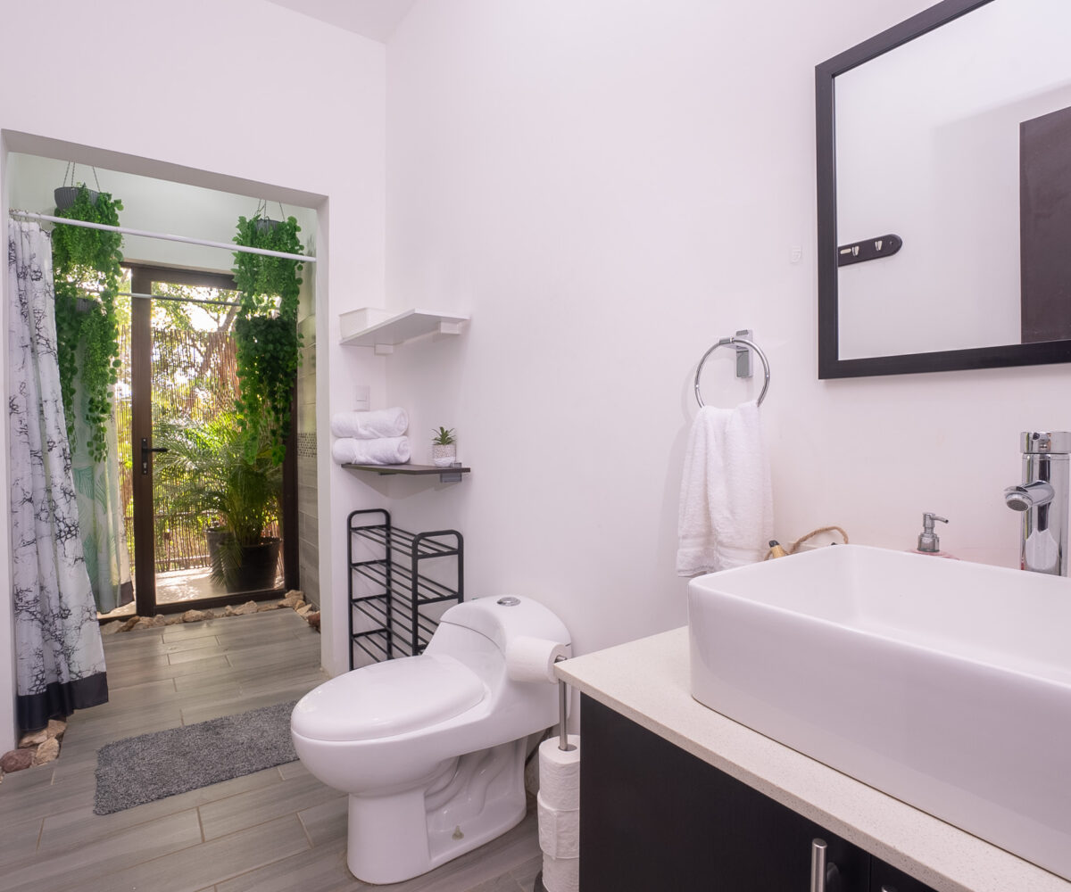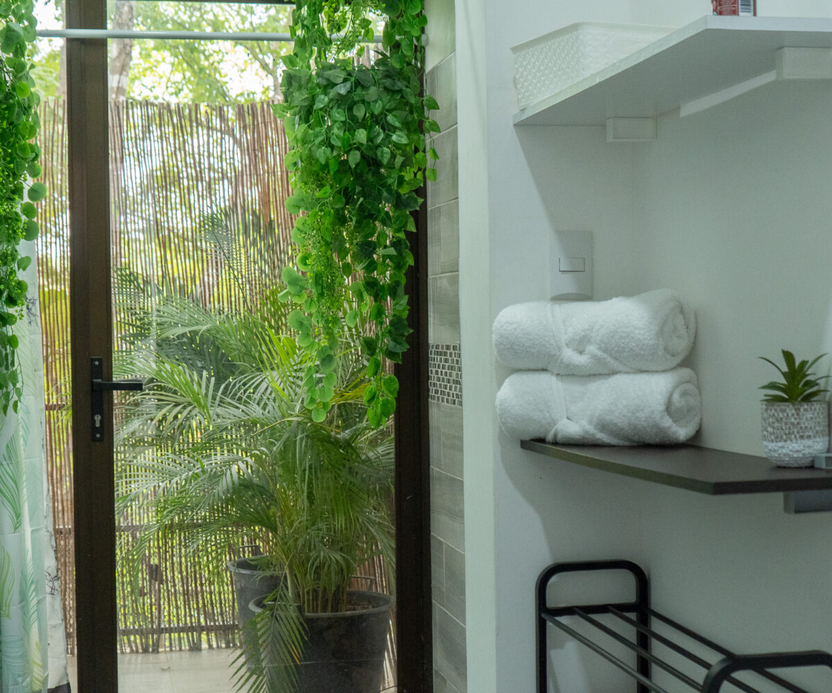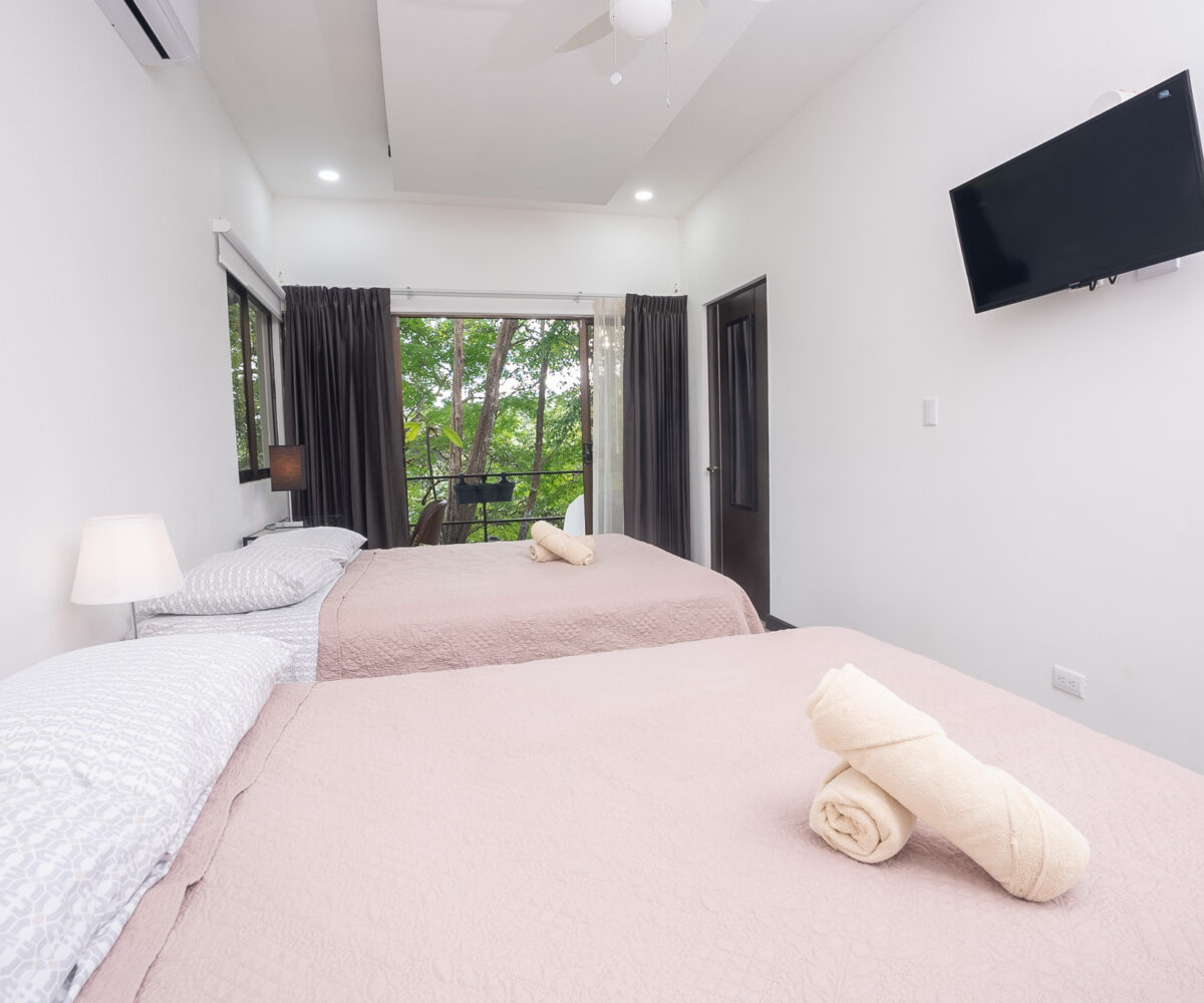 Las dos habitaciones están cuidadosamente distribuidas para ofrecer privacidad y descanso, con grandes ventanas que permiten disfrutar del verde paisaje circundante. Cada rincón ha sido diseñado para brindar confort, frescura y una conexión constante con la naturaleza.