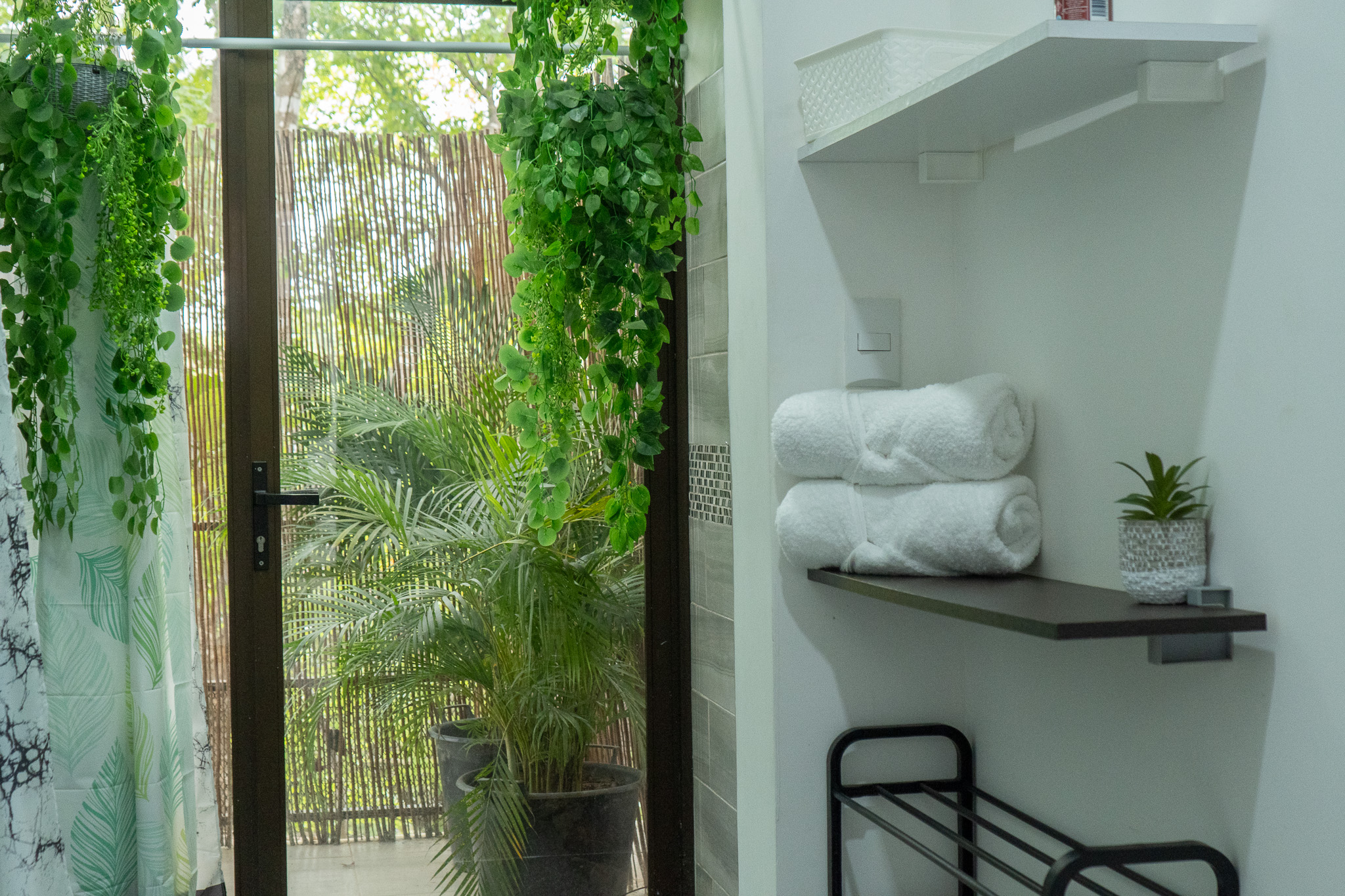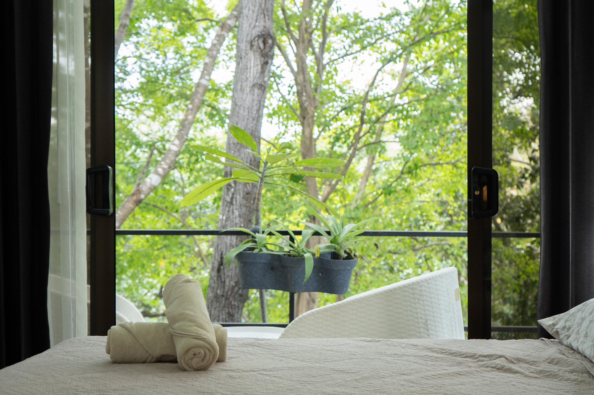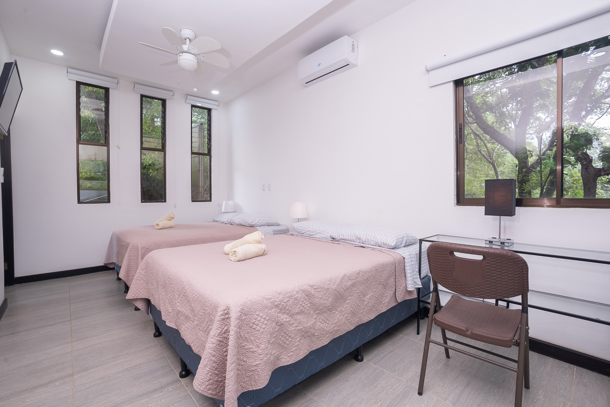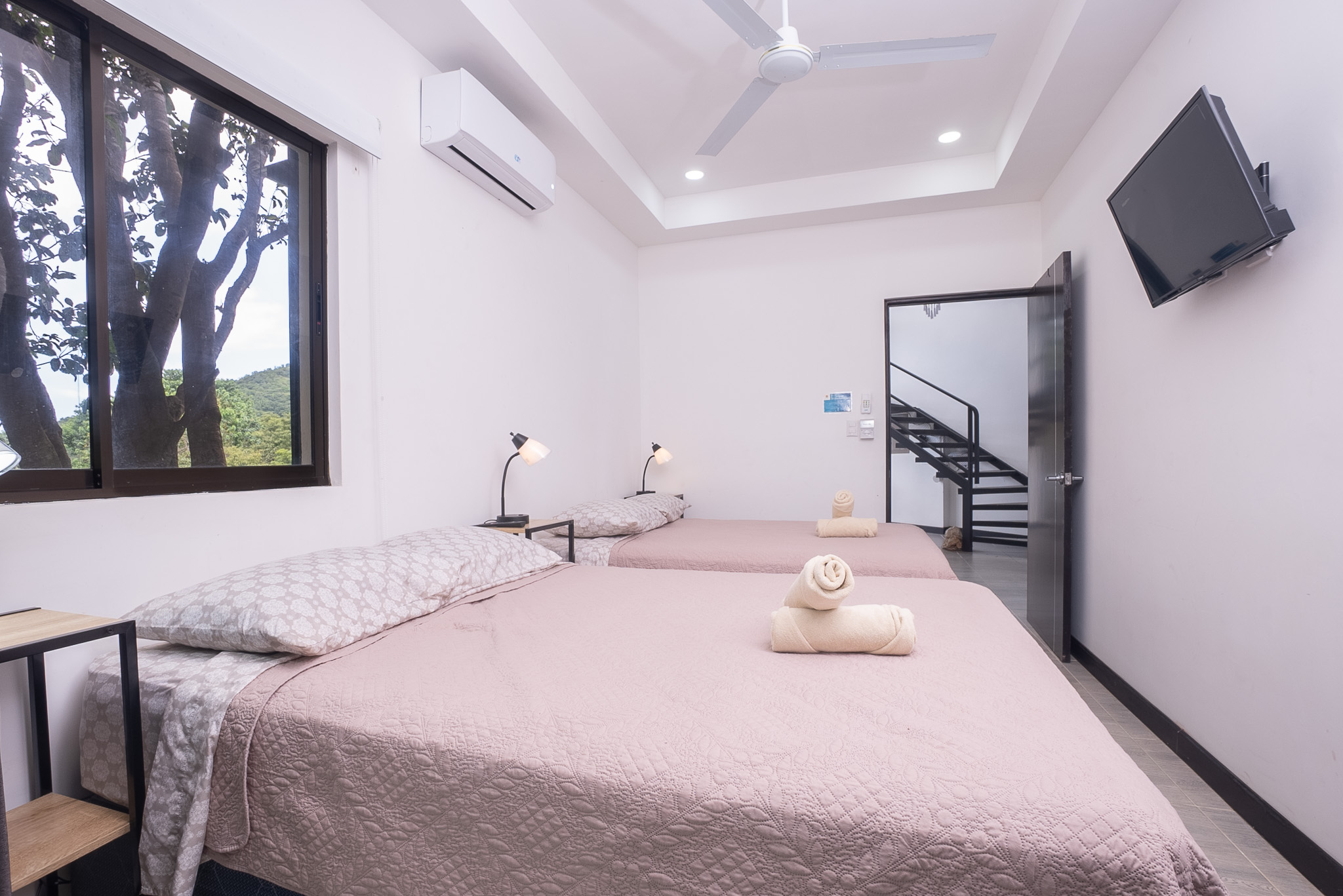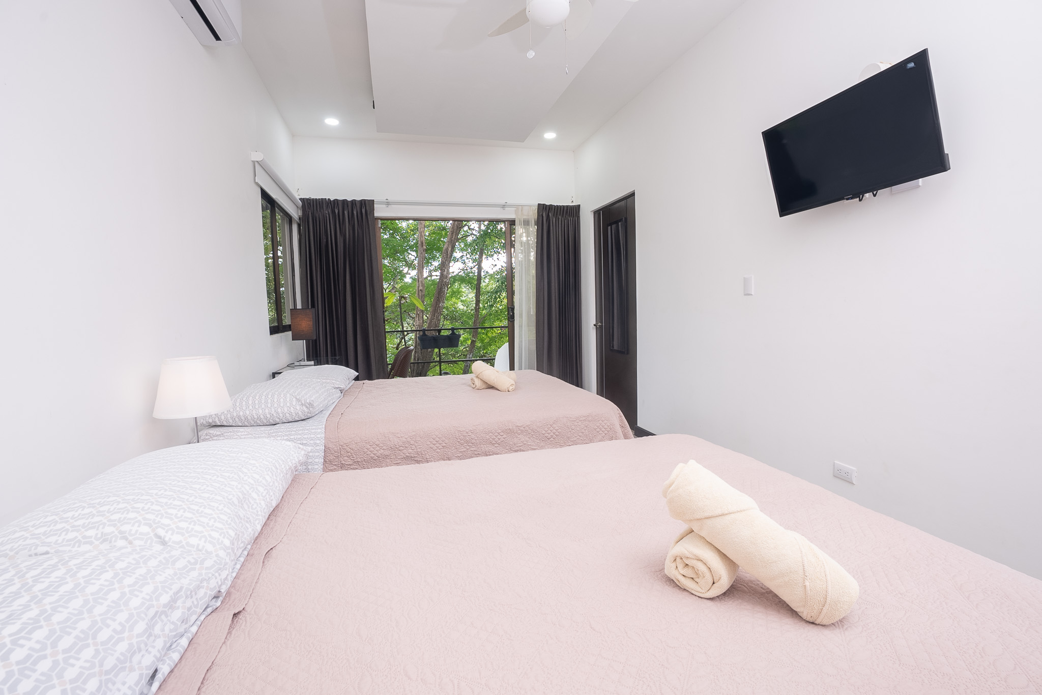 Las dos habitaciones están cuidadosamente distribuidas para ofrecer privacidad y descanso, con grandes ventanas que permiten disfrutar del verde paisaje circundante. Cada rincón ha sido diseñado para brindar confort, frescura y una conexión constante con la naturaleza.