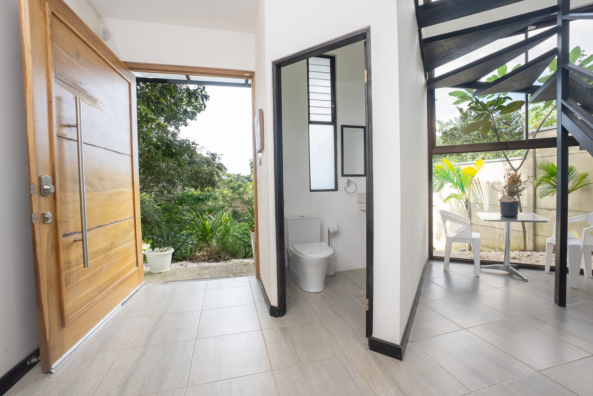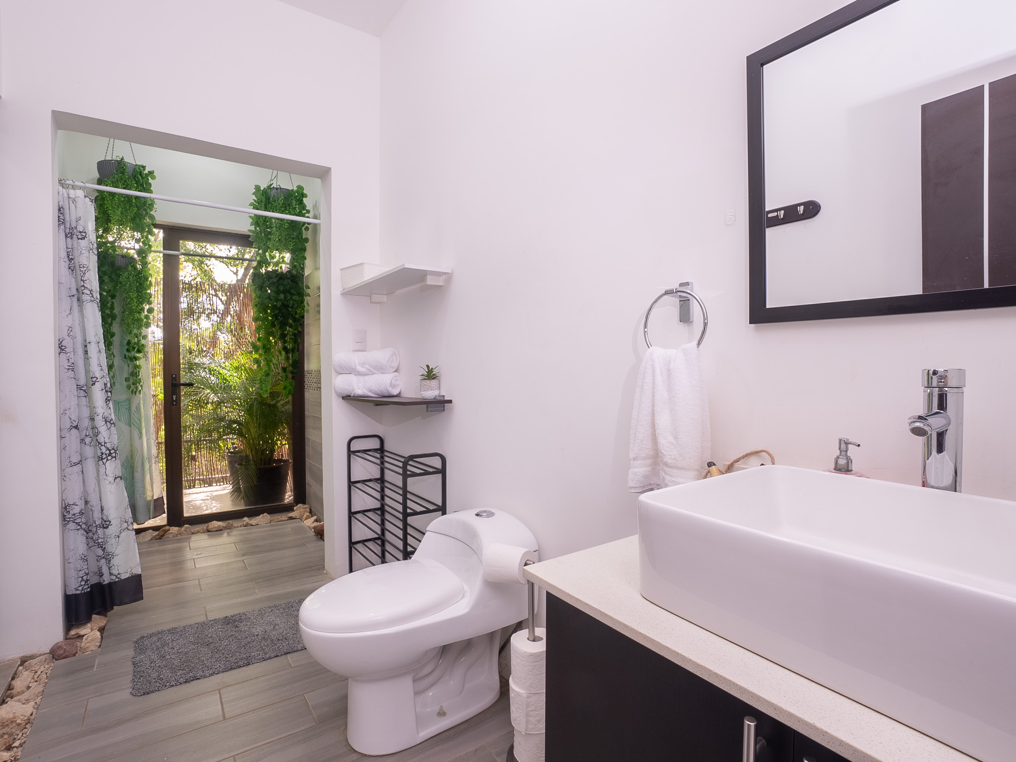 En el exterior, la casa cuenta con agradables espacios sombreados bajo los árboles, perfectos para relajarse en una hamaca, leer, o simplemente disfrutar de la tranquilidad del lugar.