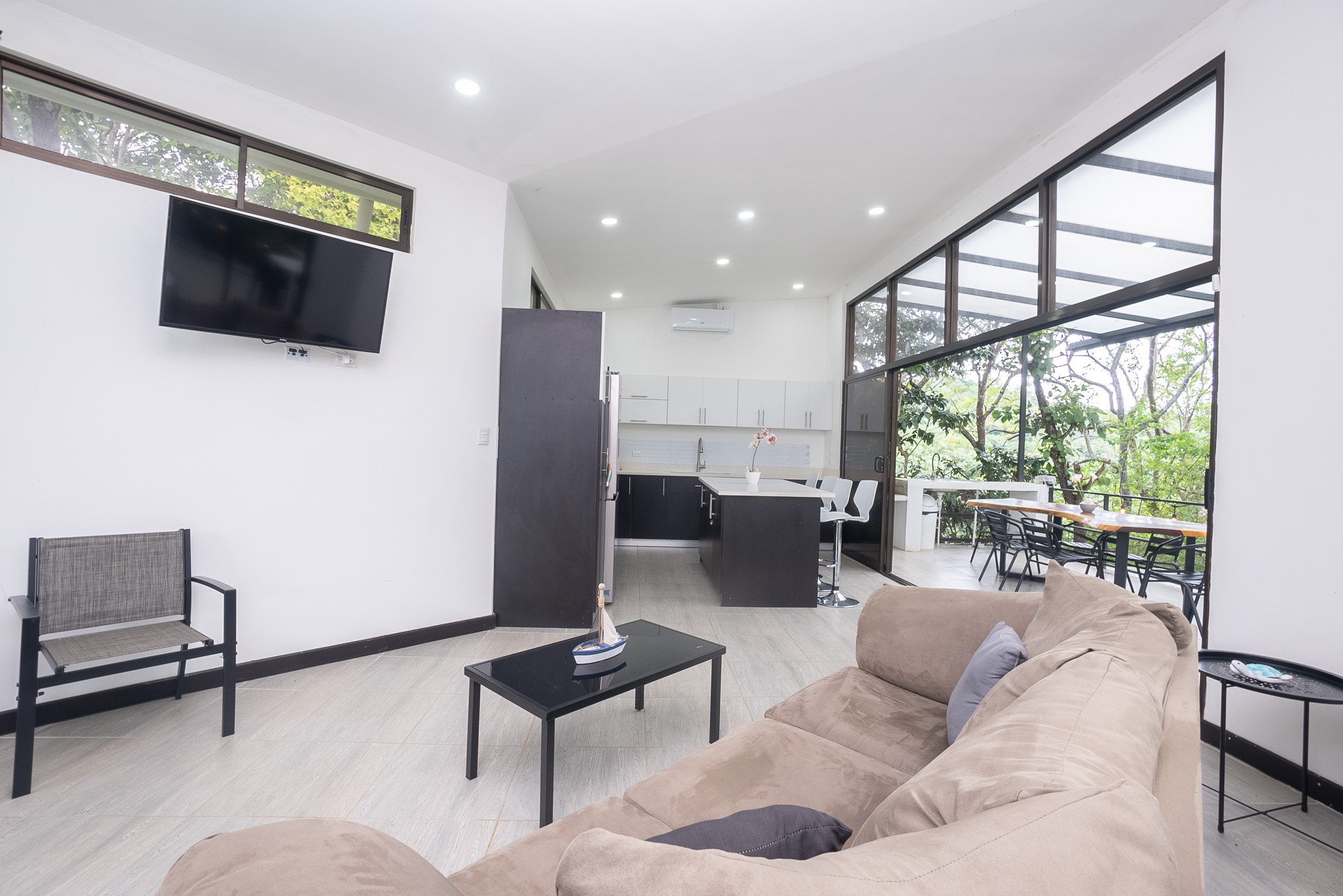 Desde el primer momento, se percibe una profunda sensación de paz. La sala de estar se integra de forma abierta con las áreas comunes, creando un ambiente acogedor ideal para descansar, compartir en familia o simplemente dejarse envolver por el entorno. La cocina, orientada hacia el exterior, permite preparar tus comidas favoritas mientras escuchas el canto de las aves o el susurro del viento entre los árboles.